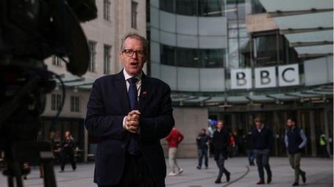 图为2025年11月11日,BBC记者大卫·西利托(左)在伦敦BBC办公室入口外进行报道时对着镜头讲话。这位即将离任的BBC总干事因美国总统唐纳德·川普的演讲被错误剪辑而辞职。