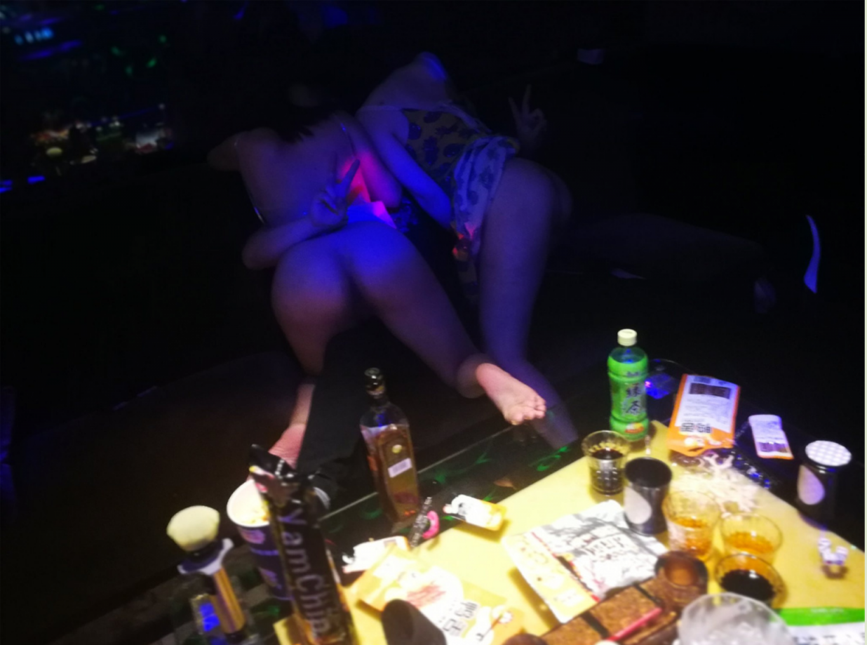 就在这充满刺激感地做了十来分钟,我们都正快活和亢奋时,唱了两三个小时歌都没进来一次的服务员突然推门而进!当时我们正侧对着门口,突然感觉到左边的门口被打开,扭头一看一个男服务员已经推开了一半的门呆愣着在原地,这瞬间姐姐也被吓到赶紧拿刚脱下的衣服捂住脸躲到我的后边,那个男服务员估计也是第一次遇到这样的情况,愣了半秒赶紧关门离开