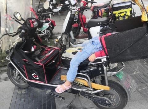 有人只是晒出一张照片:一个外卖员的破旧不堪的电动车车座上,躺着一个女孩。骑手不知是她的爸爸还是妈妈,因为害怕女孩从车上跌落,只好用黑色的橡胶带将她固定。或许正值午休送餐时间,此时的她因为疲倦,躺在了电动车上。上身周围,是家人为她休息搭建的黑色隔板。