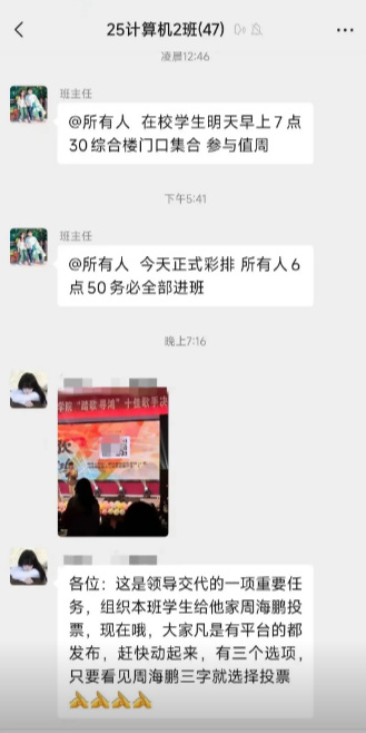 近日,郑州电力职业技术学院的一位副校长要求全体师生帮其在浙江工业大学上学的儿子周海鹏投票,并强调这是领导布置的“一项重要任务”。该校的一名学生把截图发到抖音后,却被班主任威胁删除。