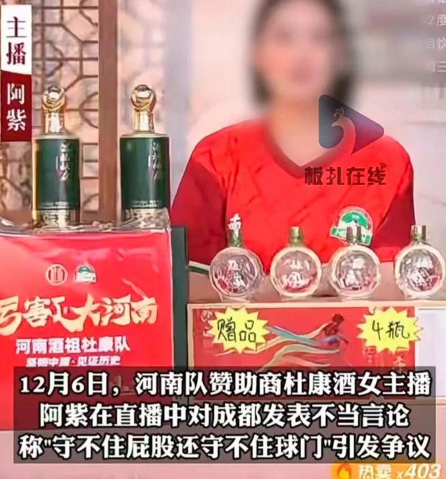 据陆媒报道,12月6日晚,在足协杯决赛河南队0-3不敌北京国安后,河南队赞助商杜康酒在直播间为球队加油时,一名身穿河南队球衣的女主播在直播中发表了不当言论。直播片段显示,该女主播在谈及成都时称:"真是丢人死了,是哪,成都是吧,我记得我看过一个评论,什么守不住屁股,还守不住球门。"并忍不住噗嗤一笑。事件发生后,该品牌旗下的直播间关闭了评论功能和四川地区的发货。